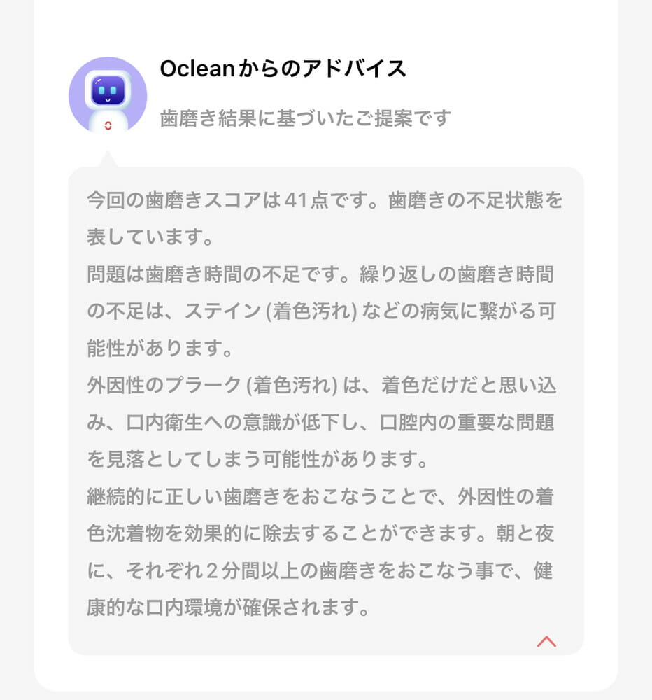 ▼OcleanのAIによるアドバイスも表示。過去の歯磨き結果に基づいて、課題点や改善点を教えてくれる。