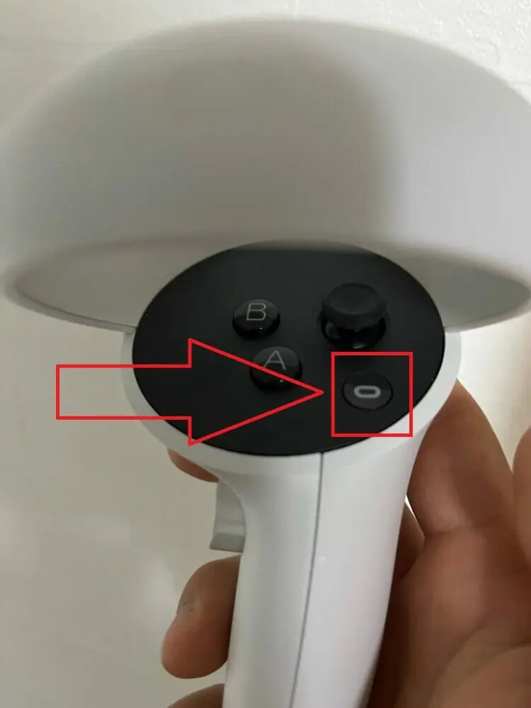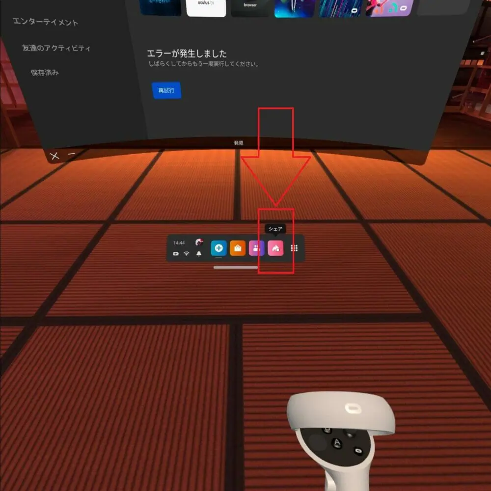 Quest 2のホーム画面が表示されたら、右手のコントローラーの「Oculusボタン」をクリックし、ユニバーサルメニューを表示します。