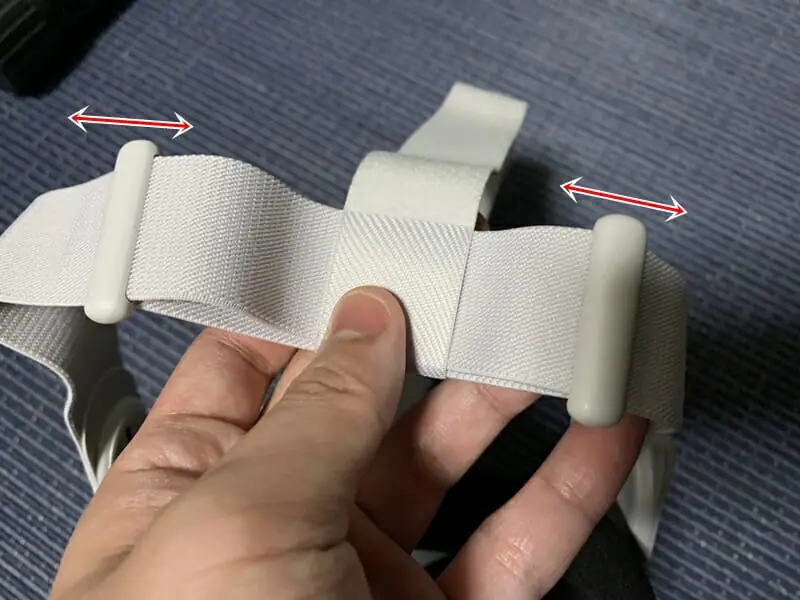▼後頭部に当たる部分のベルトは、固定具を左右に動かすことで締付け具合を簡単に調節できる。