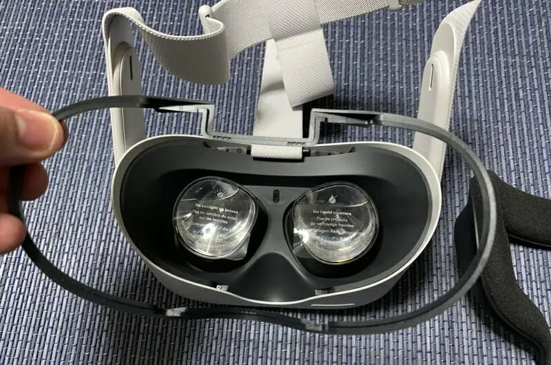 眼鏡を装着した状態でQuest2を利用する場合、スペーサーを取り付けずに装着すると、ヘッドセットのレンズ部分とメガネが直接当たってしまい、圧迫感を感じることがある。