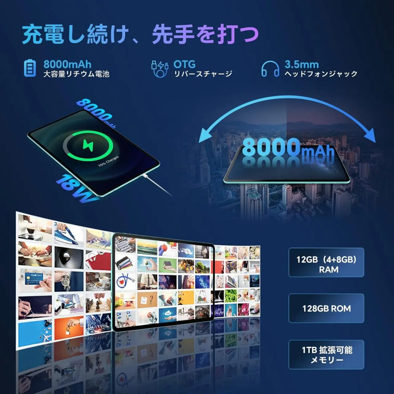 そして大容量8,000mAhバッテリーを内蔵。外出先でも長時間の連続使用が可能です。