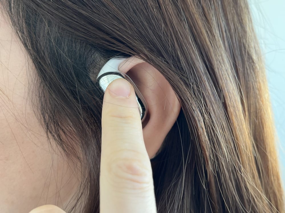 イヤホンは耳穴を塞がず、軽く当たる程度の感触。インナーイヤー型イヤホンのような、耳穴を塞がれる不快感や圧迫感を感じることはなかった。