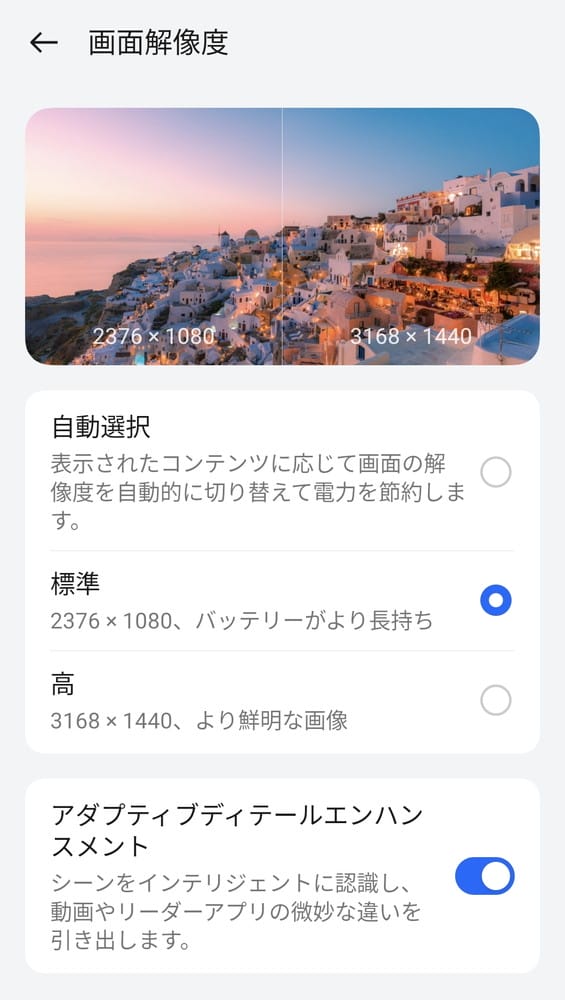 ▼解像度も切り替えが可能。バッテリー残量に応じて自動的に調整を行う機能も用意されている。