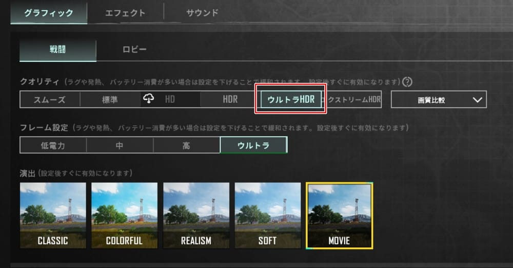 まずグラフィッククオリティに関しては、現時点で最高設定の『ウルトラHDR』までを選択することが出来た。