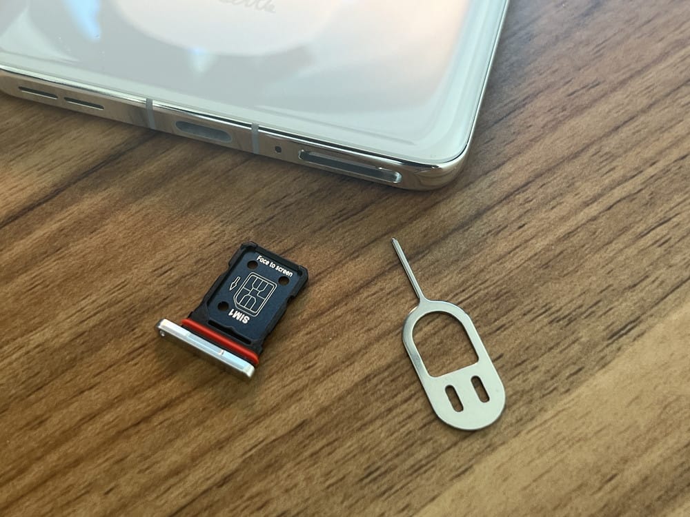 ▼付属のピンを用いてスロットを開き、デュアルnanoSIMカードの挿入が可能。