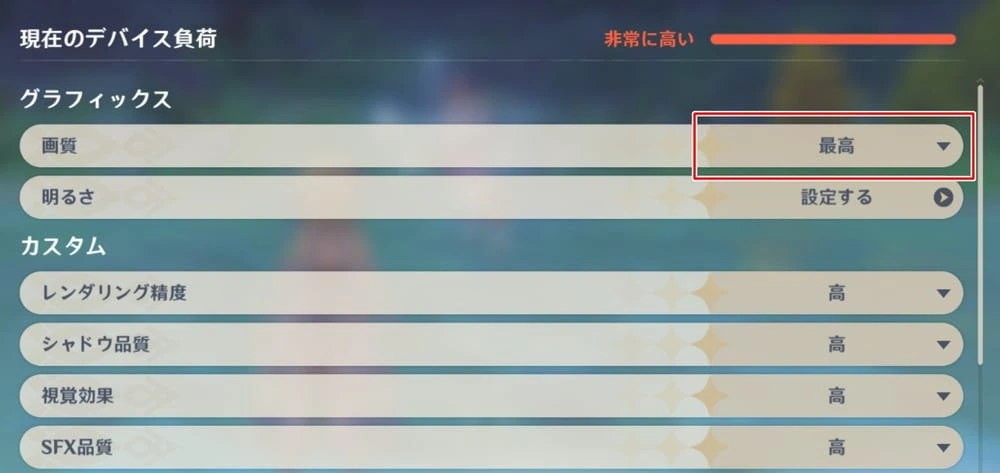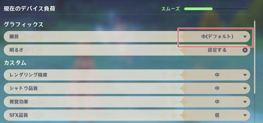 ▼画質設定はデフォルト状態で "中(Medium)" に設定されており、デバイス負荷は "スムーズ" の状態。