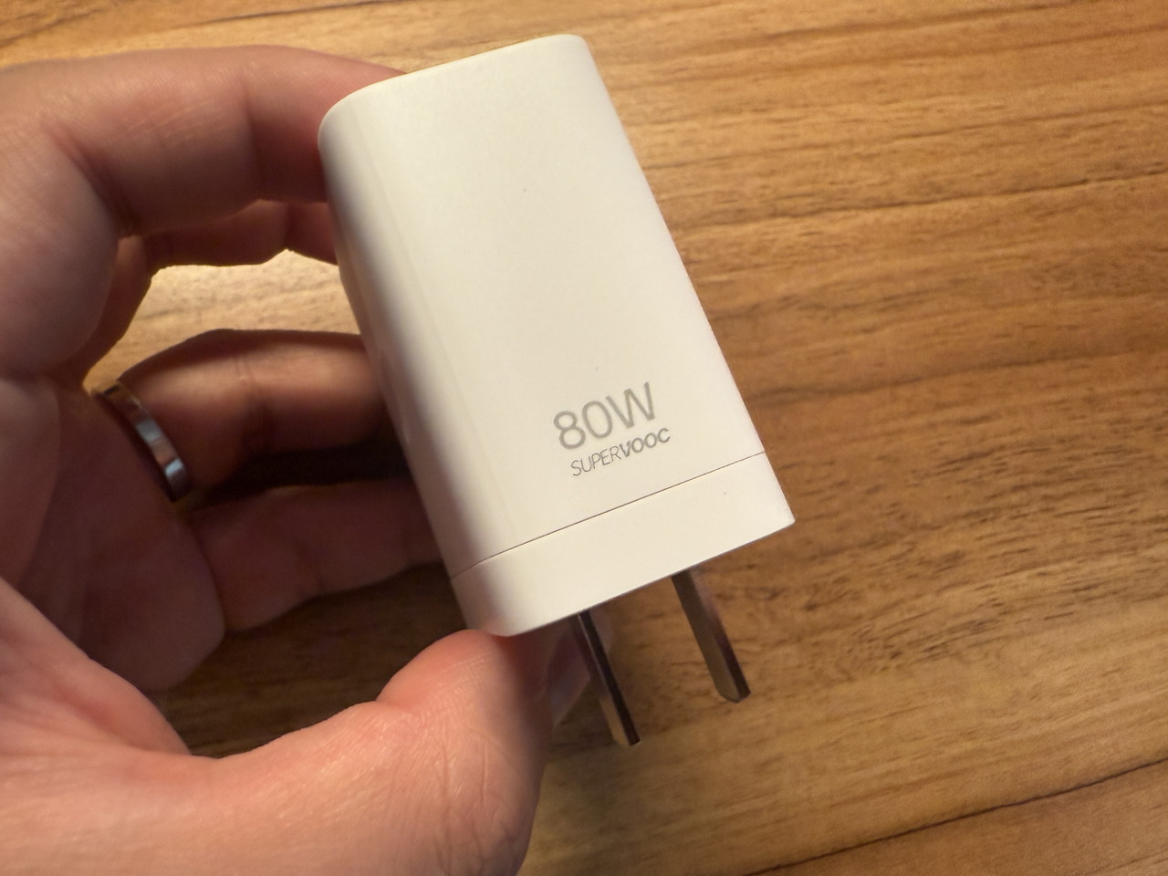 OnePlus Ace 5 Racingの電源アダプタを手に持っている