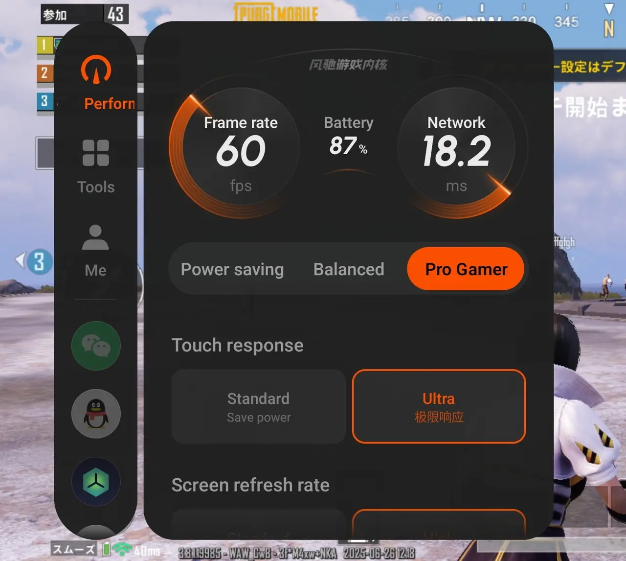 ゲームアプリプレイ時に画面縁をスワイプすると、ゲーミング向けの様々な機能が用意されたウィンドウが出現する。