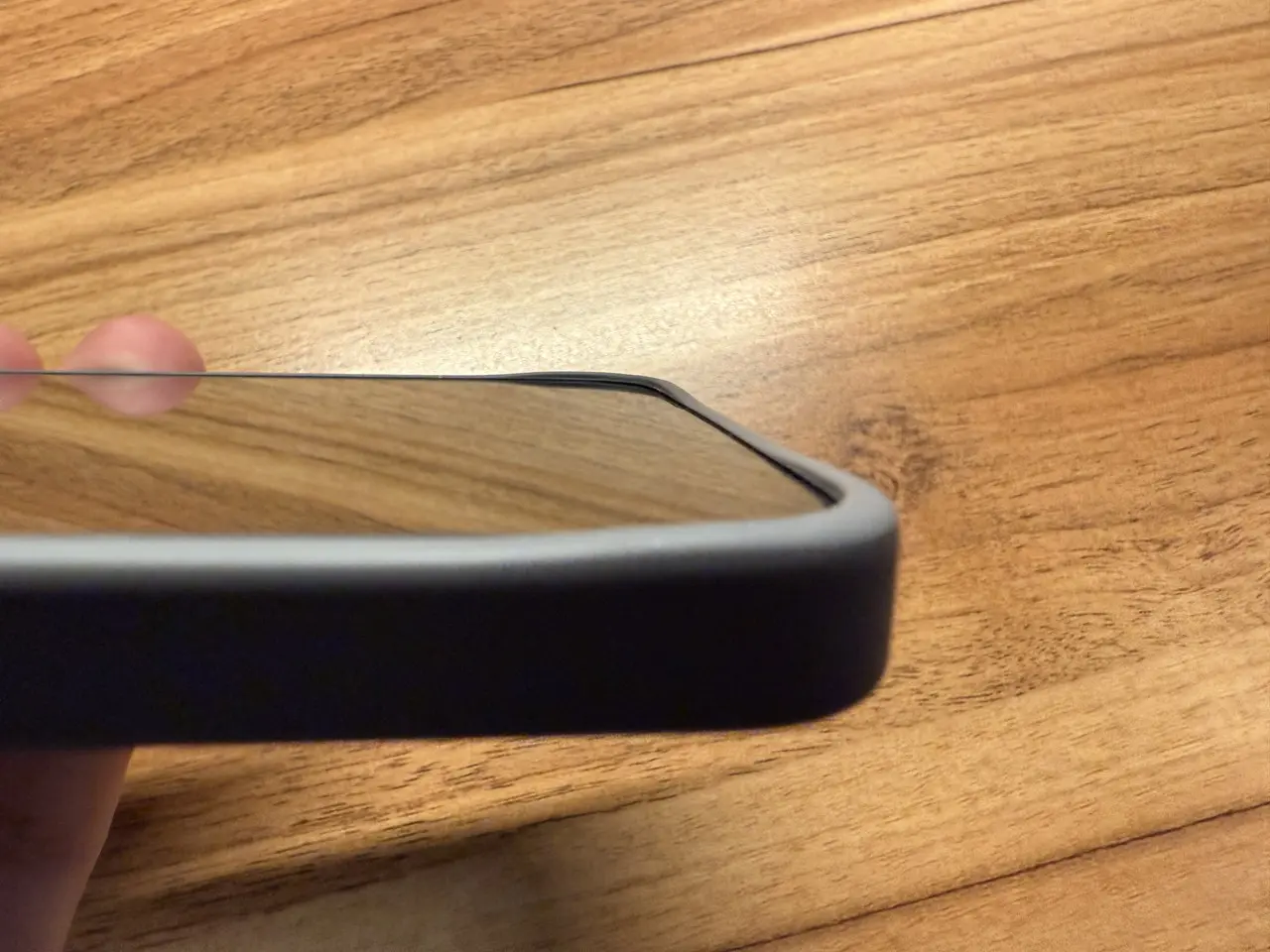ケース装着時、ケース中腹部の高さはディスプレイとほぼ同じレベルになるが、四隅がやや出っ張った形状となっており、地面にディスプレイ側から落としてしまった場合でも、画面に直接衝撃が加わるのを防げるようになっている。