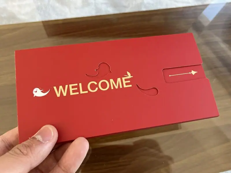 ▼WELCOMと描かれた小箱の端を右に引っ張ると、ゲームデザインのSIMカードスロット開閉用ピンが現れる。