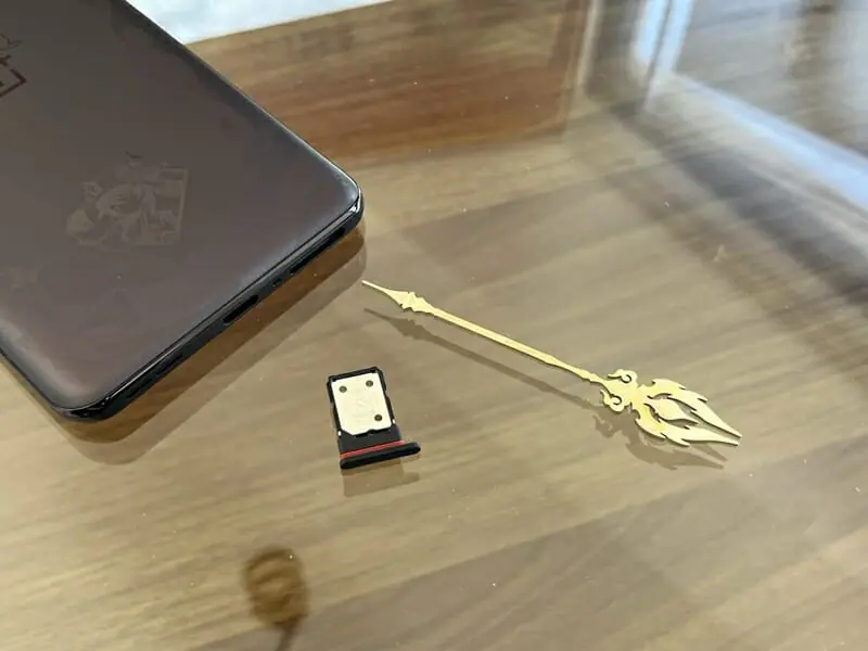 ▼付属のピンを用いてスロットを開き、デュアルnanoSIMカードの挿入が可能だ。マイクロSDカードの挿入には対応していない。