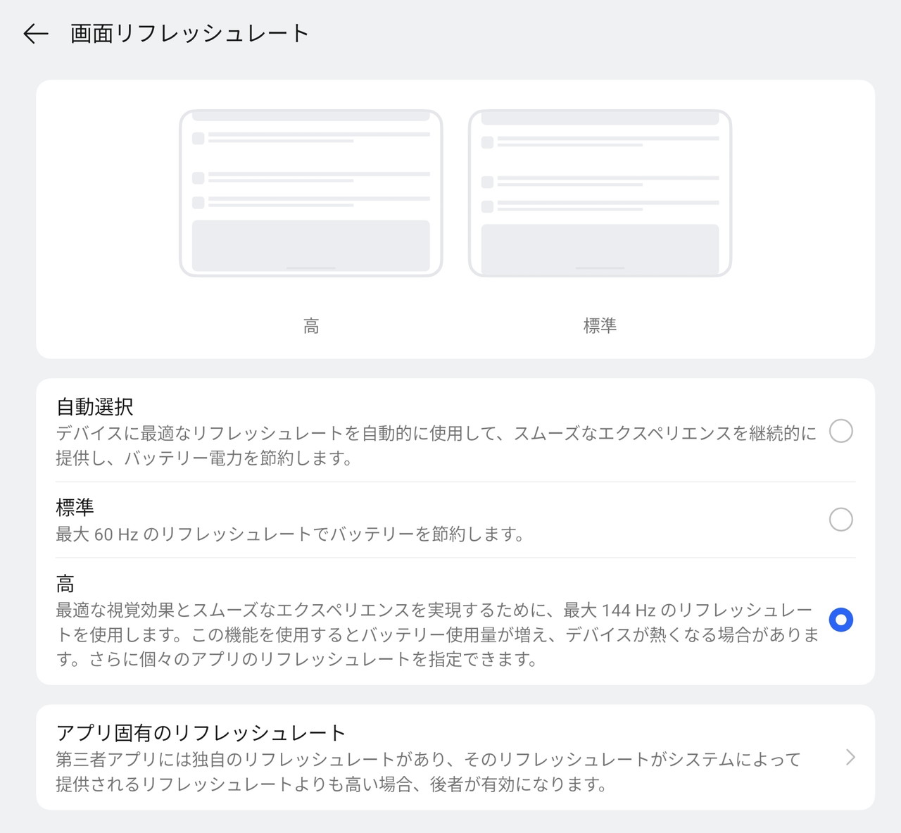 ▼リフレッシュレートは設定アプリより切り替えることができる。