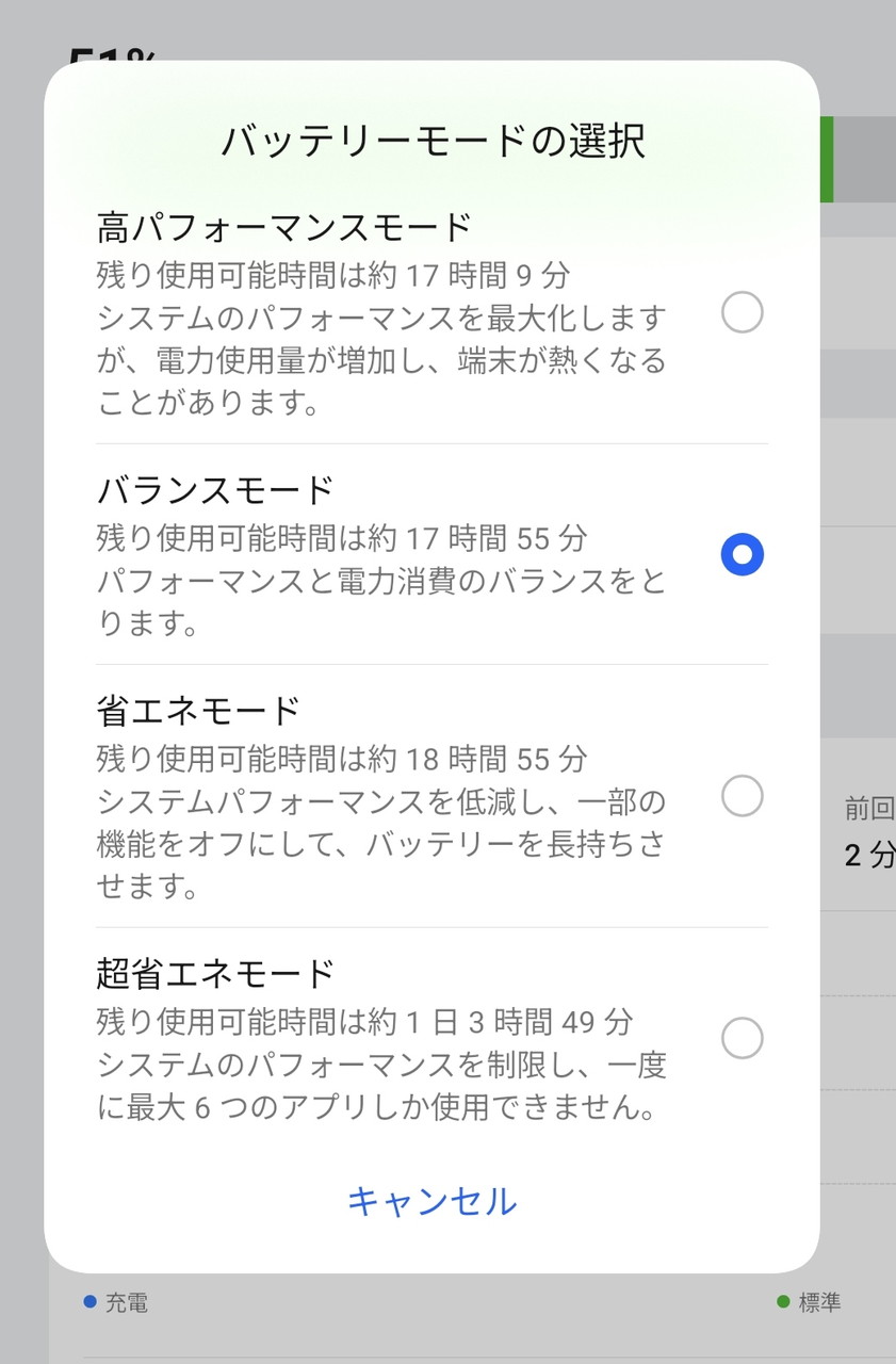 ▼パフォーマンスモードの切り替えも可能。バッテリー残量と相談して調整すると良いだろう。