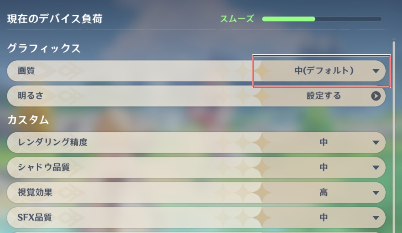 ▼画質設定はデフォルト状態で "中" に設定されており、デバイス負荷は "スムーズ" の状態。