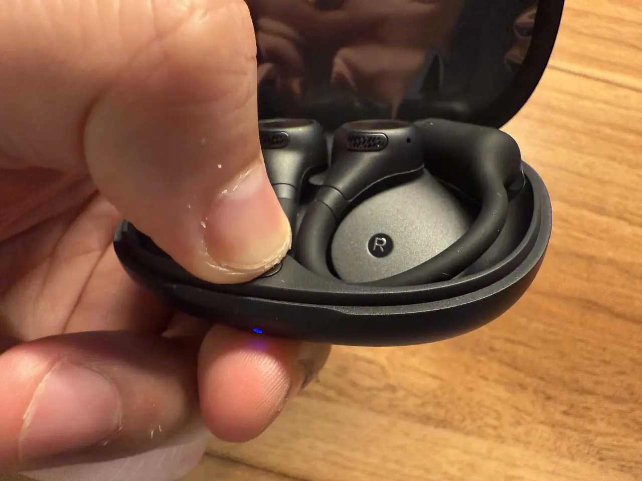 充電ケースのフタを開け、ペアリングボタンを長押しするとインジケーターが点滅し、すぐにペアリングスタンバイ状態となります。