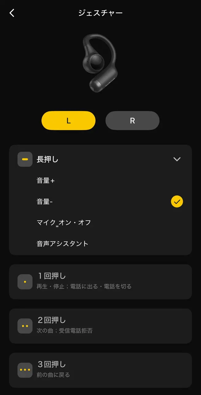 長押しした場合の機能のみカスタマイズ可能。1回、2回、3回押しの場合の機能は変更できません。個人的には、誤動作を防止するためにボタン機能をオフにする選択も用意してほしかったです。