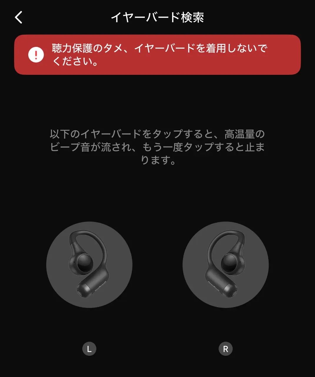 そしてイヤーバード検索機能(イヤホン検索)も用意。イヤホン本体から大きな音を発生させて位置を特定することが可能。イヤホンがどこに行ったのか分からない場合に、見つけ出すのに便利です。