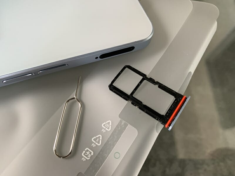 ▼付属のピンを用いてスロットを開き、nanoSIM+eSIMのデュアルSIM、および最大1TBまでのマイクロSDカードの挿入が可能だ。