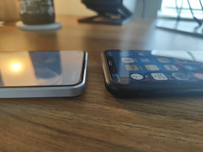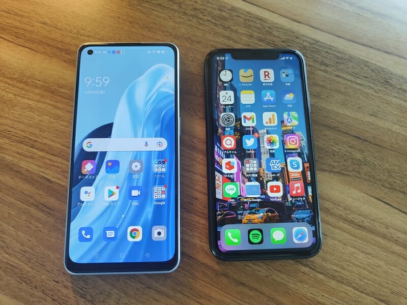 ▼iPhone XR(画像右)と並べた様子。OPPO Reno7 Aの方が縦に一回り大きい。