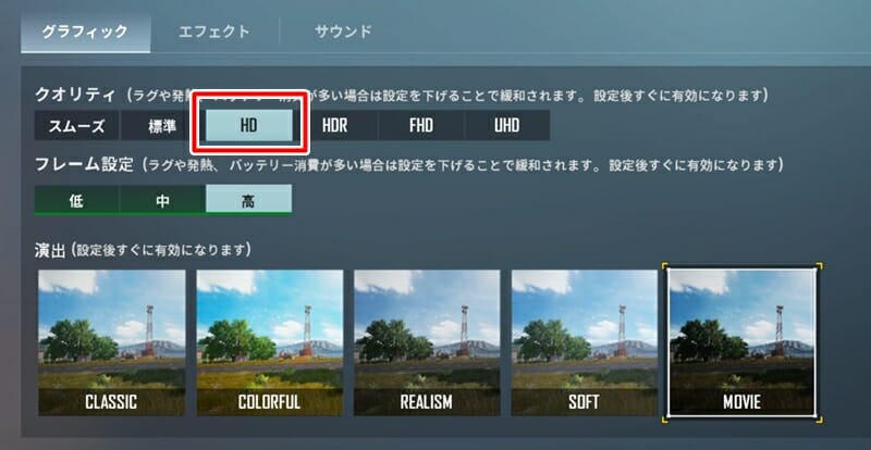 まずグラフィッククオリティに関しては『HD』までを選択することが出来た。