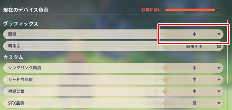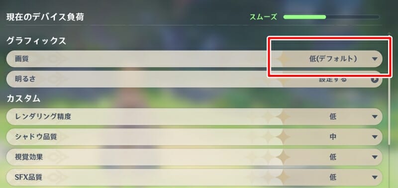 ▼画質設定はデフォルト状態で "低" に設定されており、デバイス負荷は "スムーズ" の状態。
