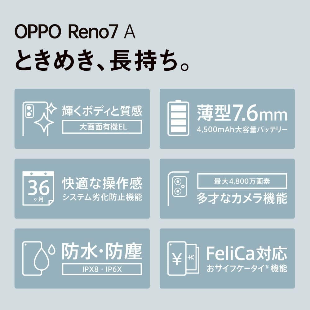 OPPO(オッポ:中国)は、2022年6月に、シリーズ累計130万台の出荷台数を誇るReno Aシリーズの最新モデルである『OPPO Reno7 A』を発売した。
