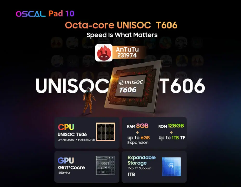 Oscal Pad 10は「Octa-core UNISOC T606 オクタコアプロセッサー」を搭載しており、負荷の高いタスクをこなすことができる。また8GB RAM(最大6GBの仮想RAM拡張に対応)のおかげで、マルチタスクも楽々こなすことが可能。
