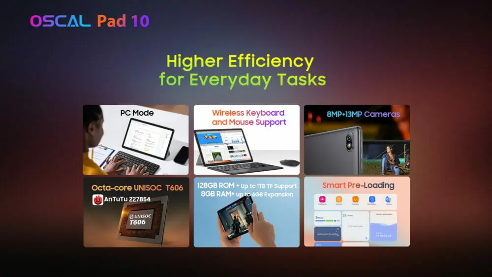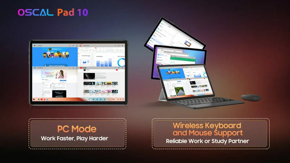 『Oscal Pad 10』はPCモードをサポートしており、ワイヤレスキーボードとマウスと組み合わせて用いることで、タブレットをPCのようにも扱うことができ、作業の生産性を新たな高みに引き上げられるだろう。