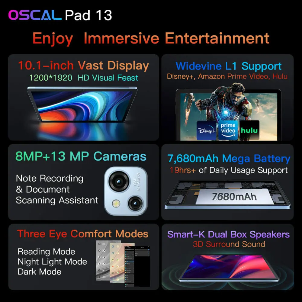 Oscal Pad 13には、鮮やかな自撮りや高精細なビデオ通話が可能な8MPのSamsung® S5K4H7フロントカメラが搭載されている。さらに、13MPのリアカメラを使ってドキュメントのスキャンや最大4Kのビデオ録画が可能。