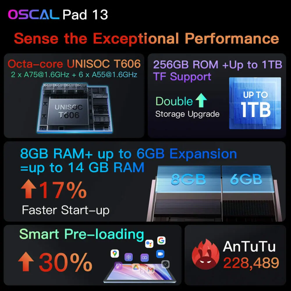 Oscal Pad 13は、Unisoc T606 オクタコアプロセッサーとMali-G57グラフィックスプロセッサを搭載しており、要求の厳しいゲームアプリも快適に動作する高性能なタブレットとなっている。8GB RAMを搭載しており、最大14GB RAMまで拡張可能。複数のアプリを同時に開いてもタブレットはスムーズに動作する。