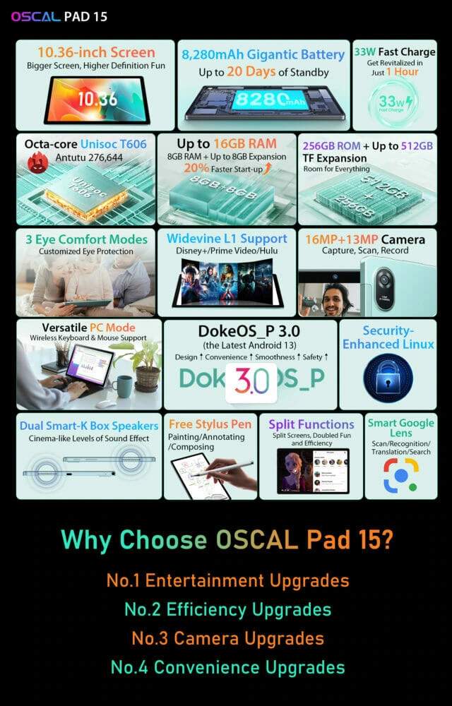 他には高解像度の16MP+13MPカメラ、Android 13ベースのDokeOS_P 3.0 UIシステムなど、快適なタブレット利用を実現できるよう設計されている。