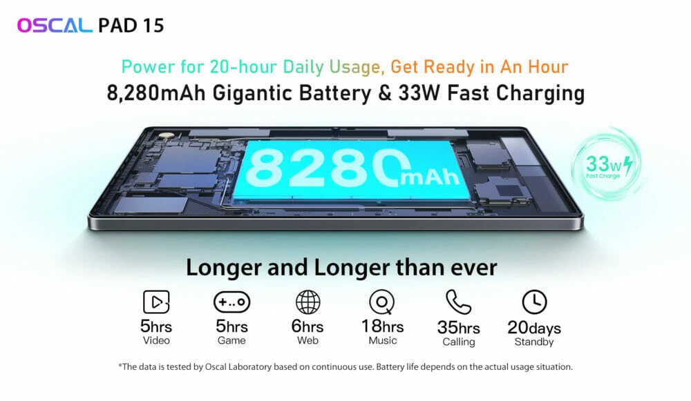 7.6mmの薄さと449gの軽さにも関わらず、Pad 15は、今までのOscal Padシリーズの中でも最大の8,280mAh大容量バッテリーを備えている。これにより、1日最大20時間のタブレット使用や、最大6時間のウェブブラウジングが可能となっている。移動中の充電効率を向上させるため、Pad 15は33Wの急速充電に対応しており、わずか60分で満充電を完了させることができる。