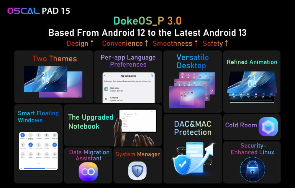 OSCAL Pad 15はAndroid 13ベースの、最先端OS「DokeOS_P 3.0」を採用し、より魅力的なデザイン、ユーザーフレンドリーなインターフェース、便利なツール、より有用になった情報保護機能を備えており、ユーザーの日常生活をさらに豊かにし、学習や仕事を促進する。