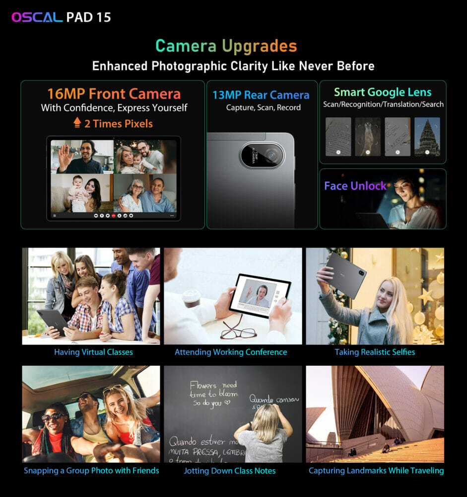 Oscal Pad 15は16MPの高解像度フロントカメラを搭載している。顔認識でデバイスをアンロックしたり、鮮明なセルフィー撮影(自撮り)を行ったり、明瞭なビデオチャットを楽しむのに最適だ。さらに13MPのリアカメラは、オンライン会議、Web授業なども用途にも適している。