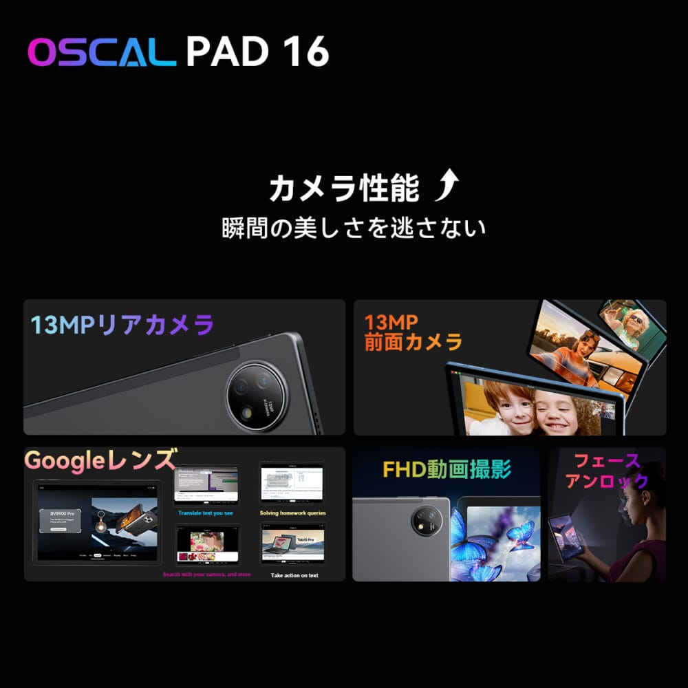 スマートGoogleレンズを搭載したPad 16は、外国語のテキストを翻訳したり、未知の植物や動物を識別したり、多くの情報を検索することができます。顔認証にも対応しており、スマートなロック解除が可能。仕事から遊びまで、幅広い場面で活用できる高品質カメラとなっています。