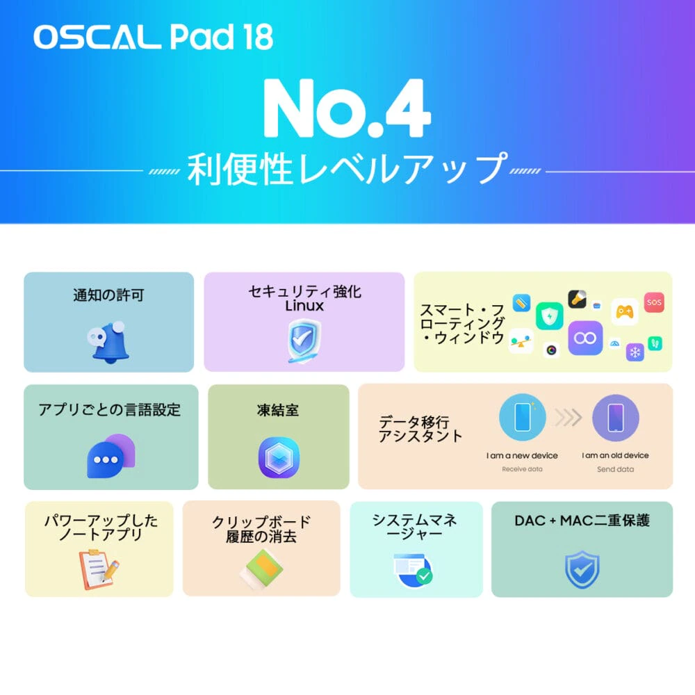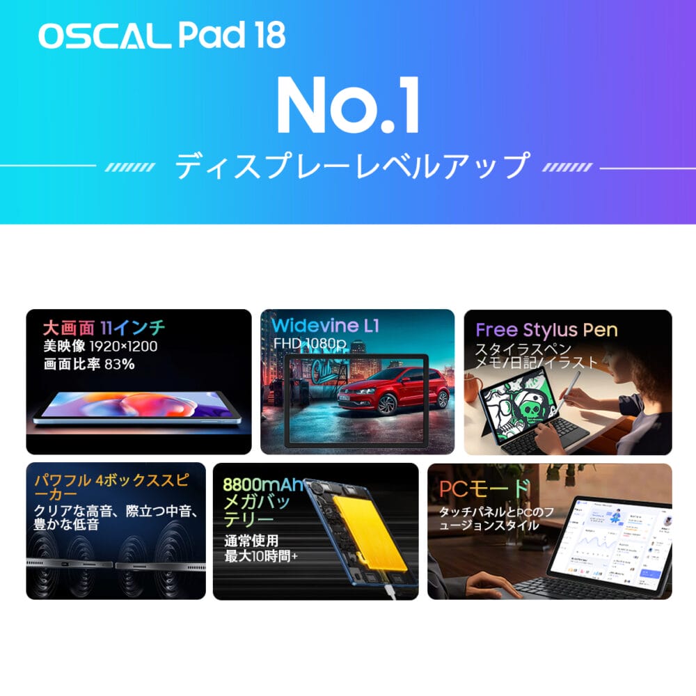 世界中のユーザーのニーズを更に満たすため、Oscalは新たなタブレット『Oscal Pad 18』を日本時間の2023年12月11日(月)にリリースする。11インチ画面、クアッドボックススピーカー、8,800mAh大容量バッテリー、最大24GB RAM、そしてAndroid13ベースのDokeOS_P 3.0を採用し、より革新的なアップグレードを備えた最新モデルとなっている。