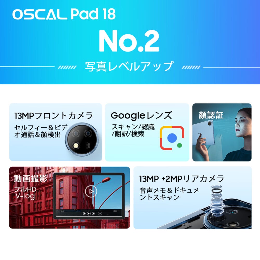 『Oscal Pad 18』は、前面に13MPのSamsungセルフィーカメラを、背面に13MPメインカメラ&2MP 深度カメラを搭載。オンライン会議から自撮り撮影、風景撮影など、幅広い用途に活用できる性能を擁している。なお前面カメラは顔認証に対応。