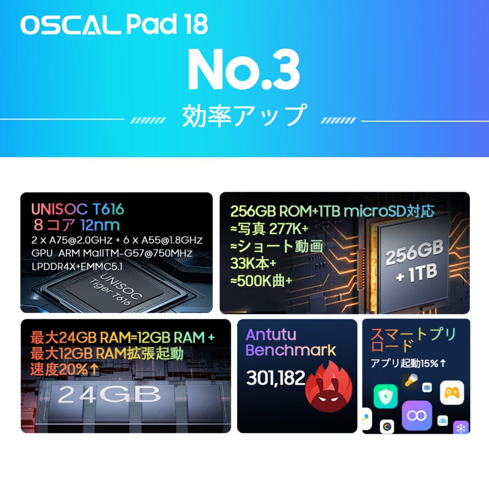 『Oscal Pad 18』は、よりパワフルな「Unisoc T616 オクタコアプロセッサー」を搭載している。8GBまたは12GBのRAMを備えており、いずれも先進的なRAM拡張機能を活用することで追加コストなしで拡張させることが可能だ。