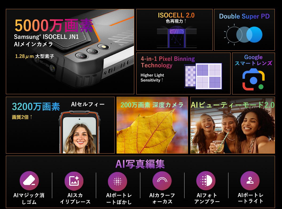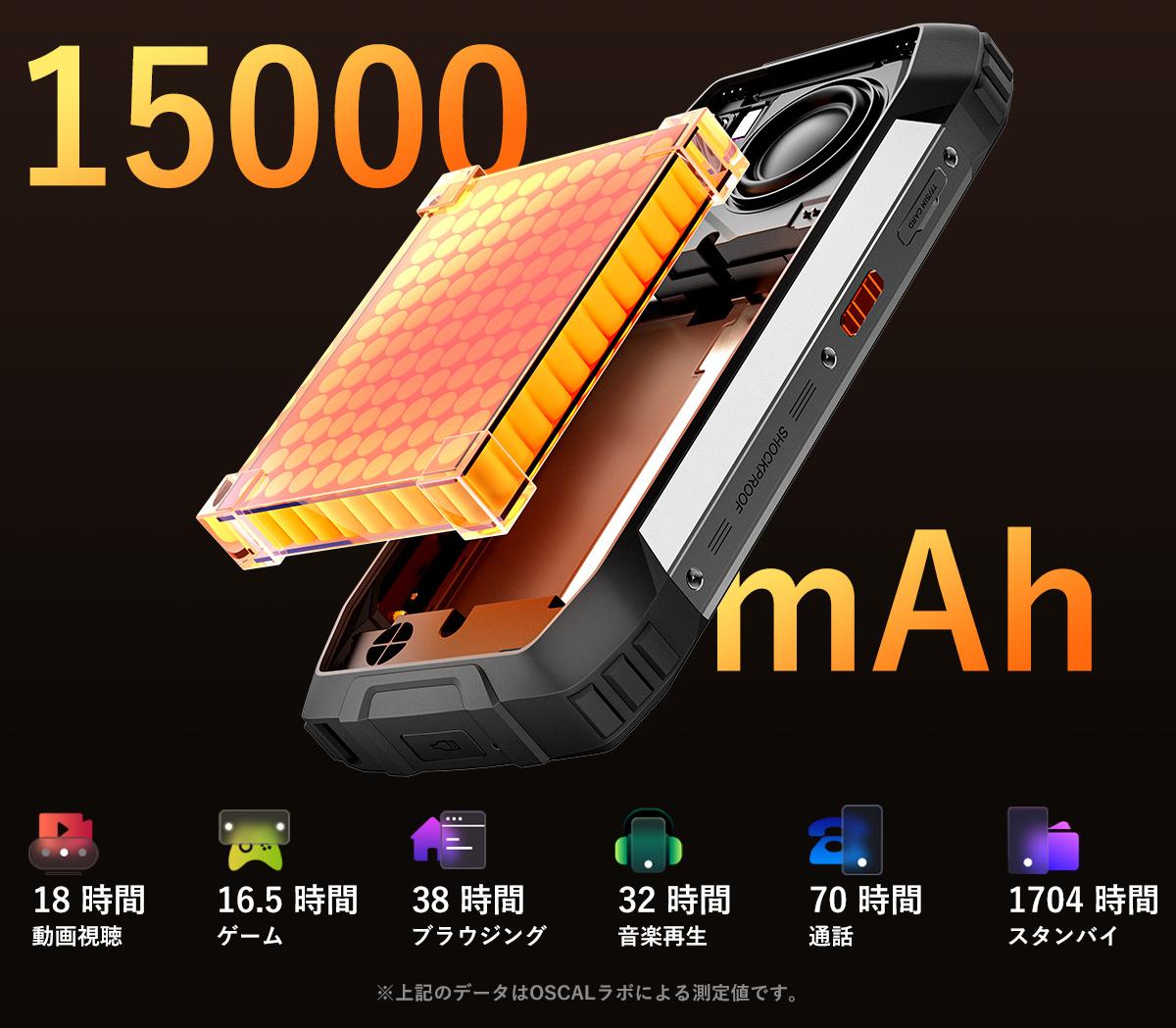 | 主な特徴 | 5W 138dB大音量スピーカー、170ルーメンフラッシュライト、15000mAhバッテリー、お手頃価格のタフネススマホ |