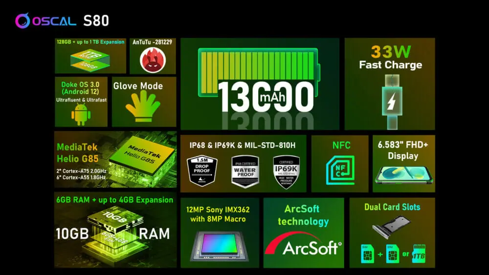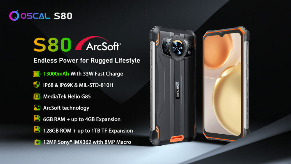 同機種のモデル名は『OSCAL S80』であり、Android12準拠の独自OSを搭載。SoCにはHelio G85オクタコアプロセッサーを採用しパワフルな性能を発揮する一方で、頑丈な筐体には13,000mAh大容量バッテリーを搭載。