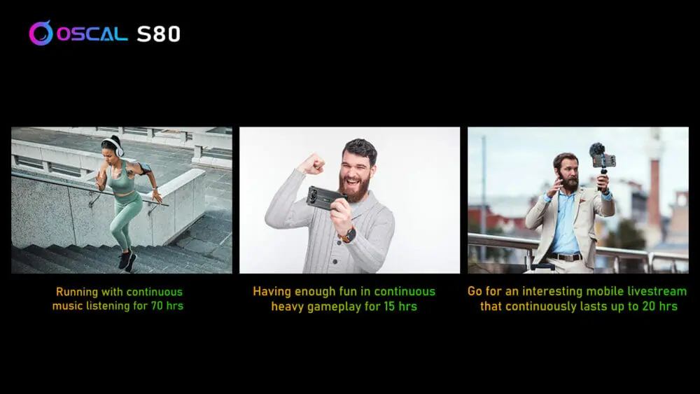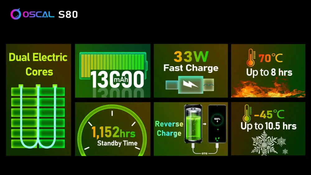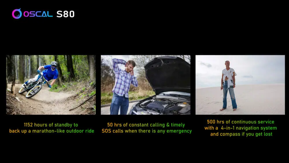 『OSCAL S80』は13,000mAhの大容量バッテリーを内蔵しておりユーザーが、アウトドアアクティビティを最大限に楽しんだり、旅行先を探索する楽しみを提供している。