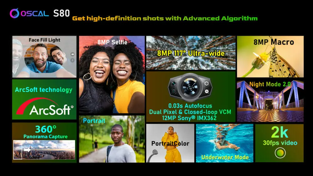 『OSCAL S80』の前面には8MPのフロントカメラを、背面には12MP(メイン)+8MP(超広角)+2MP(深度)カメラを内蔵している。