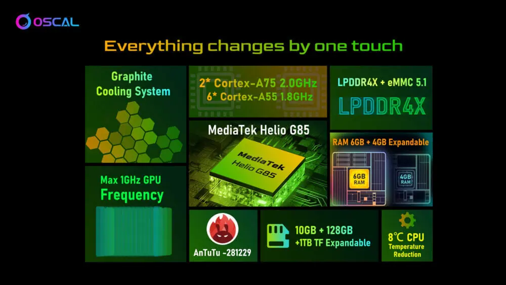 Oscal S80は「MediaTek Helio G85 オクタコアプロセッサー」および6GB RAM(+4GBの拡張可能)を搭載しており、大抵の作業を快適にこなせるだけの性能を擁している。