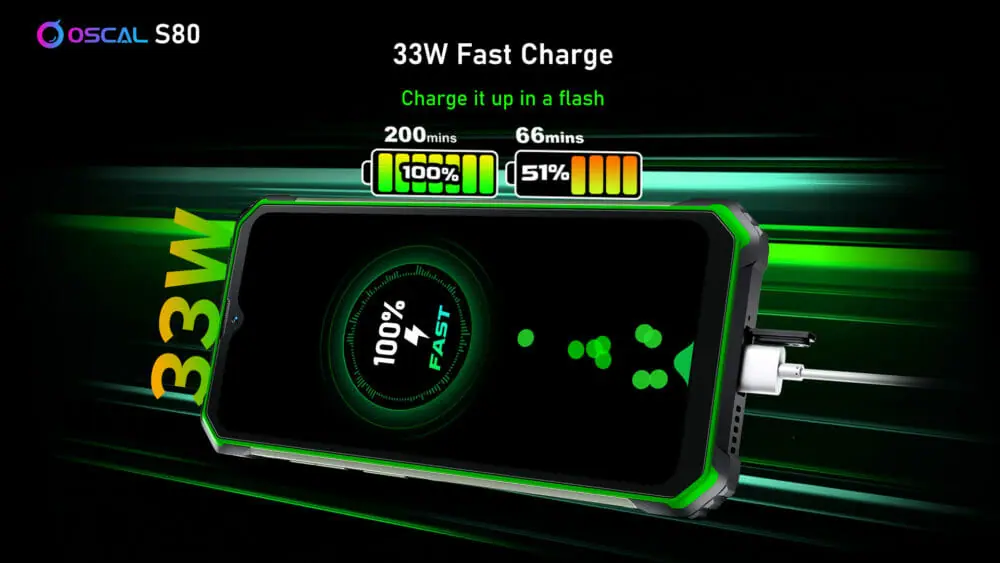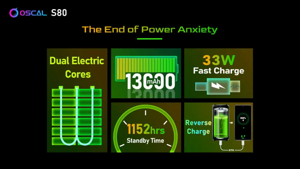 『OSCAL S80』は13,000mAhの大容量バッテリーを内蔵しておりユーザーが、アウトドアアクティビティを最大限に楽しんだり、旅行先を探索する楽しみを提供する。