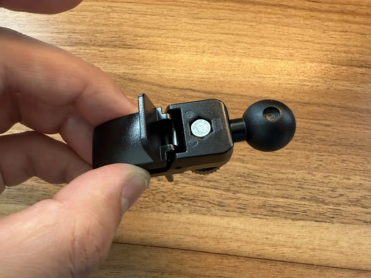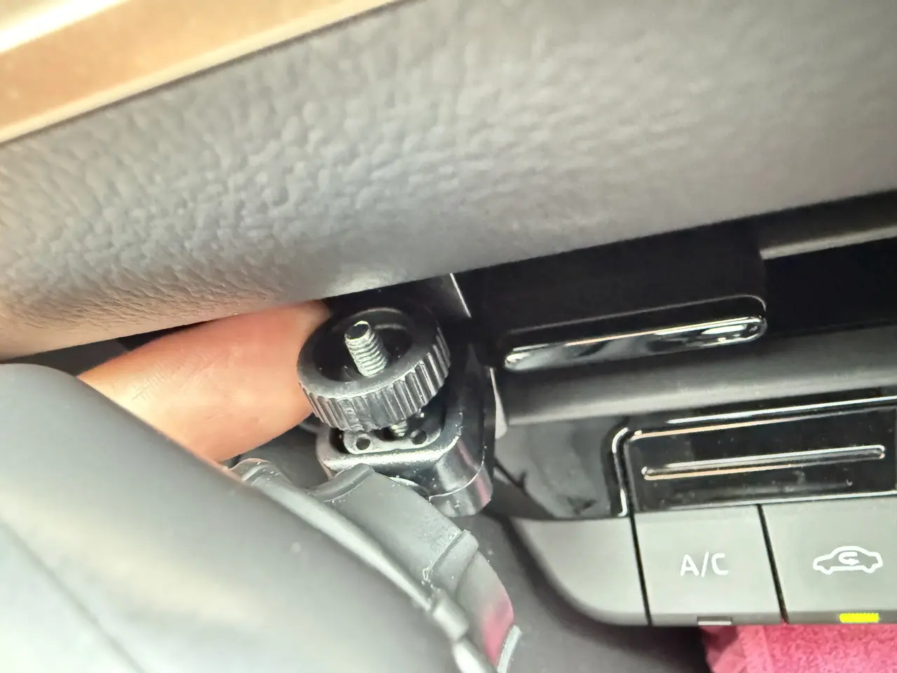 ▼ボールヘッドスタンドの先端で、エアコンルーバーを挟み込む。