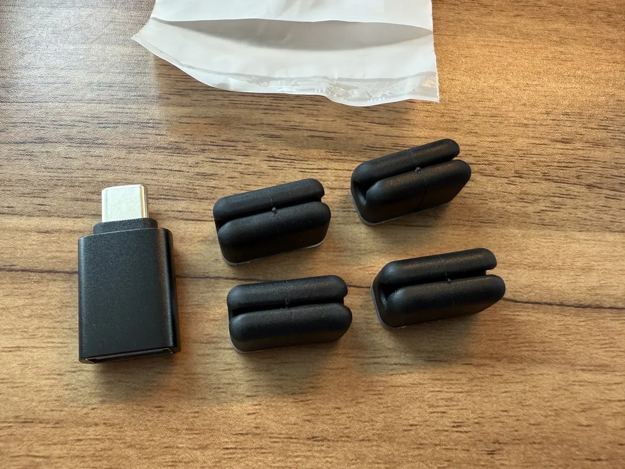 ▼Type-A to C変換アダプタと、計4つのケーブルクランプが付属。ケーブルクランプはケーブルを固定しておくのに役立つ。