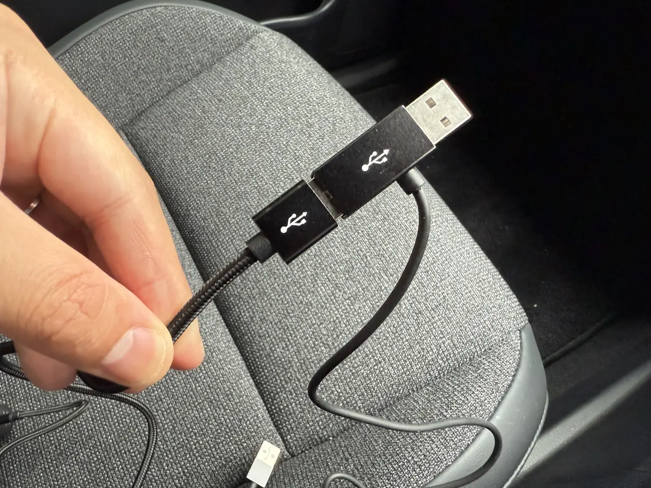 そして、Y字電源ケーブルのサイドから伸びているUSB Type-Aケーブルを、USBカーチャージャー(別売り)に接続する。