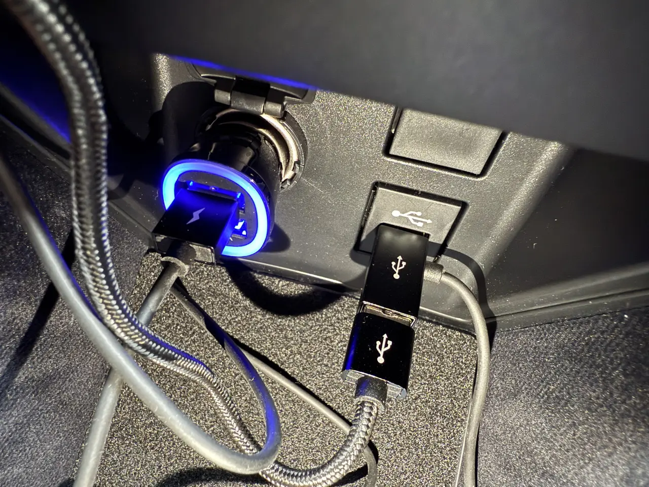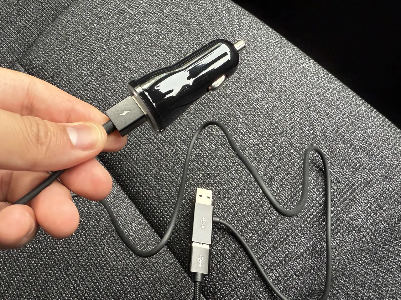 最後に、カーチャージャーを車両のシガーソケットに、Y字電源ケーブルの先端をUSB Type-Aポートに接続する。