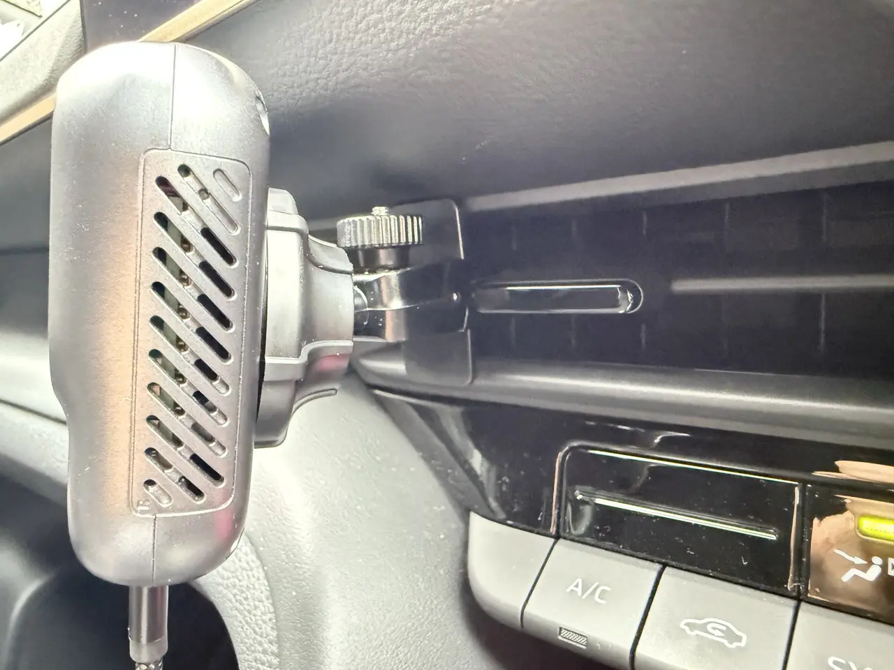 ▼エアコンルーバーに取り付けることで場所を取らず、狭い車内でも邪魔に感じることはないだろう。