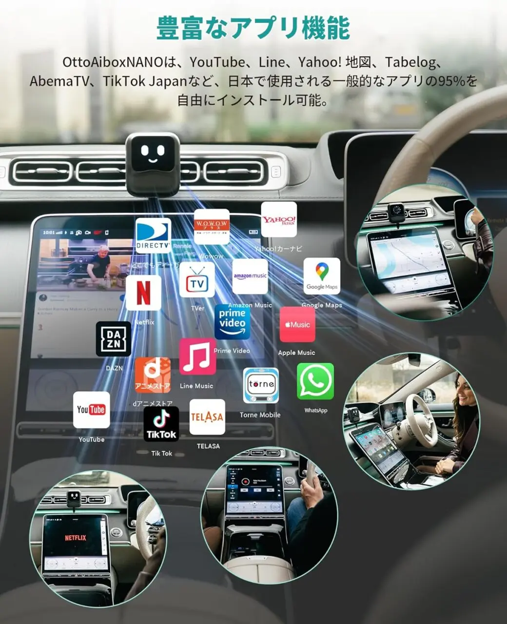 車に接続するだけで、カーナビのインターフェースがOttoDrive 2.5に切り替わる。スマホのように自由にアプリをインストールできるほか、Wi-Fi接続、もしくはクラウドSIMを利用してインターネットに接続でき、YouTubeやネットフリックス、Amazonプライムビデオなどのコンテンツを視聴できるようになる優れものだ。